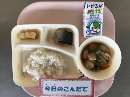 3月11日(月)の献立は「さばの塩焼き・あつあげとさといもの煮もの・だいこんのみそ煮・ごはん・牛乳」でした。冬野菜のだいこんは、3月が使用最後となります。今日はそのだいこんをみそ味の煮ものにした一品がでました。