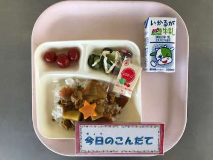 3月13日(水)の献立は「チキンカレーライス・金時豆と野菜のサラダ・プチトマト・牛乳」でした。6年生は、小学校最後のカレーライスの給食でした。思い出に残るおいしい、カレーライスになったでしょうか?