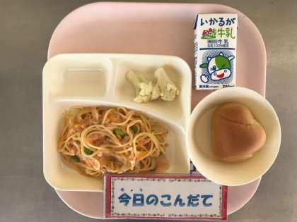 3月14日(木)の献立は「さけのクリームスパゲッティ・カリフラワーのサラダ・1/2黒糖パン・牛乳」でした。たっぷりの紅ざけフレークが主材のクリームスパゲッティは大好評でした。