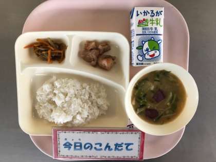 3月19日(火)の献立は「鶏肉のてり焼き・さつまいものみそ汁・きんぴらごぼう・ごはん・牛乳」でした。甘辛く仕上がったきんぴらごぼうは、ごはんのすすむ一品でした。