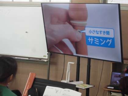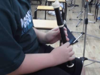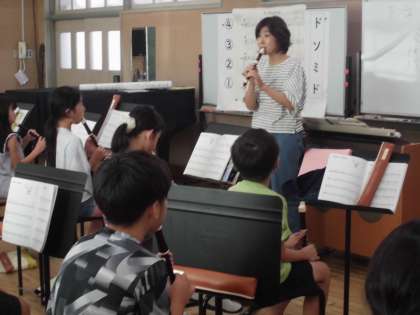 「サミング」は、高いほうのミ〜ソの音を出すために、親指の穴を少しだけ開けて吹く演奏法です。低い音を出すのと同じくらい難しいですが、そこは練習あるのみ。「サミング」の加減や、息の吹き入れる量などを調整しながら、何度も吹いていました。きれいな音が鳴ったときは「できたー」と大喜びでした。