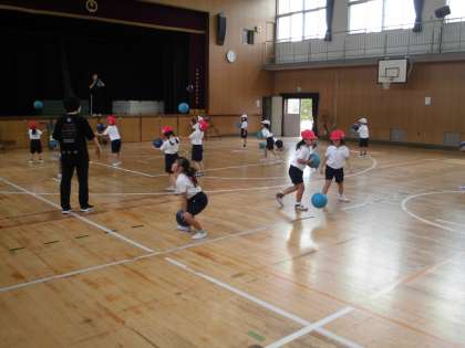 ボールを上に投げてキャッチする運動に、楽しく取り組んでいます。