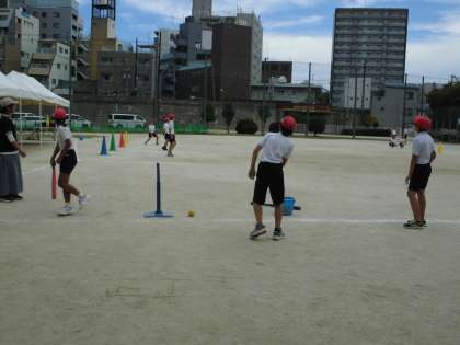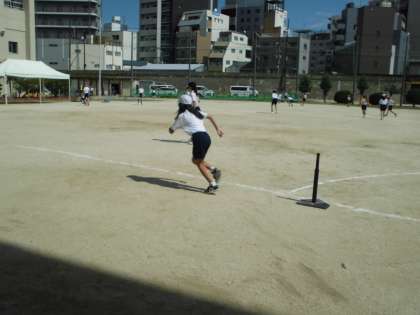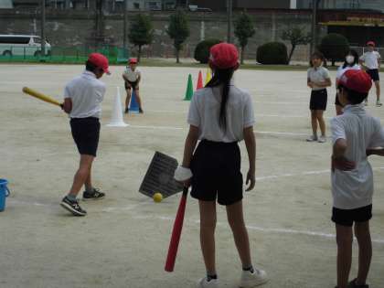 6年生が体育の学習で「ベースボール型ゲーム」の「ティーボール」に取り組んでいます。