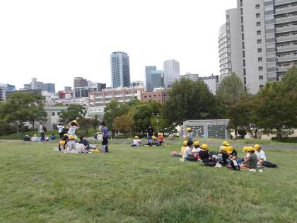 その後、「日本一長い」と言われる天神橋筋商店街を通って、扇町公園に移動してお弁当を食べました。お昼ご飯の後は、工事中で遊具は少なかったですが、公園遊びを楽しみました。