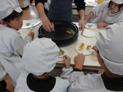 ふたをしてじっとがまん。しばらくすると甘いいい香りがしてきました。みんなで仲良くいただきました。