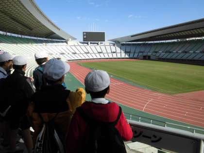 6年生がスポーツ交換会で、ヤンマースタジアム長居に行きました。旭区、西成区、浪速区の学校が、同じフィールドで陸上競技をします。