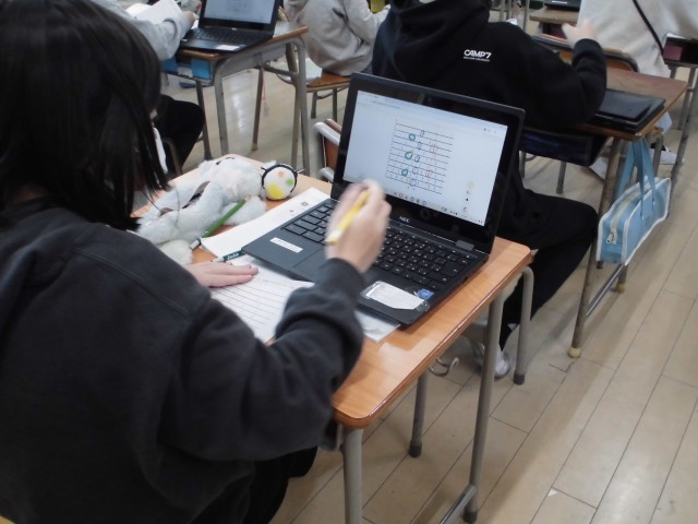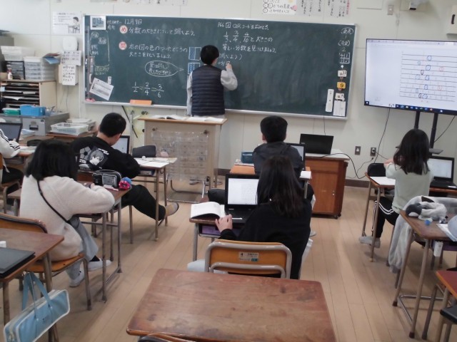 分数の大きさ比べをしています。「不等号」でどちらが大きいかを表しますが、先生の「どちらが大きい?」の質問に、体を使って「こっちー!」。楽しく学習しています。