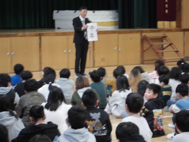 令和8年は「午年(うまどし)」です、干支のお話と午年は、馬のように力強く突っ走る年になる願いが込められているお話を聞きました。ぜひ児童一人ひとりが目標を立てて、その目標に向かって邁進する1年になればと願っています。
