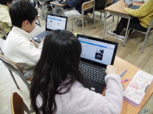 3年生は「年賀状づくり」。お正月に届いた年賀状を思い浮かべながら、パソコンを使って年賀状を作っていました。