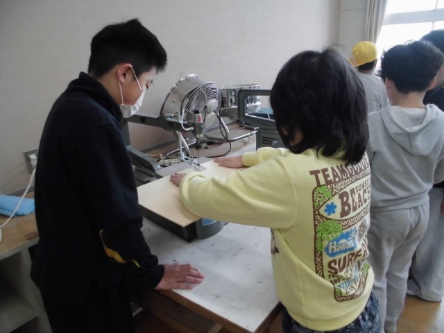 出来上がりのイメージを下絵にかいて、それをもとに切り始めています。ペアで声をかけながら、安全に糸のこぎりを使って学習しています。