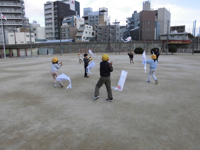 思い思いに描いたたこを、寒い寒い風に乗せて飛ばしました。