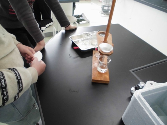 温めたお湯に食塩などを溶かし、それを氷水で冷やすと溶けたものが出てくるかを調べます。