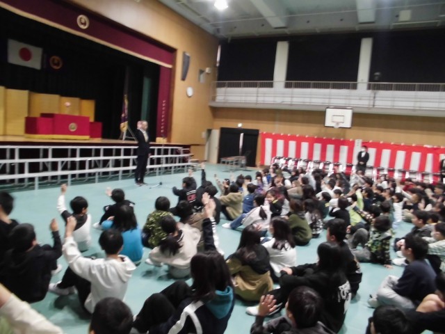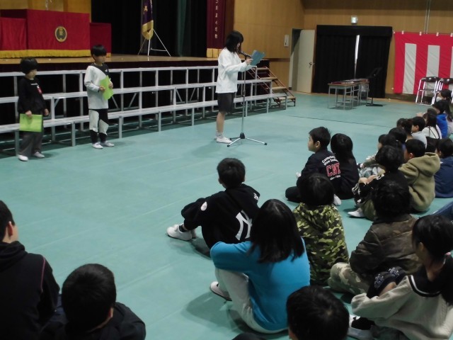 生活指導担当の先生からは「春休みのくらし」についてのお話があり、その後に1年生と5年生の児童が3学期の思い出作文を発表しました。「できるようになったこと」「林間学習で学んだこと」「最高学年としての心構え」について、しっかり発表できていました。