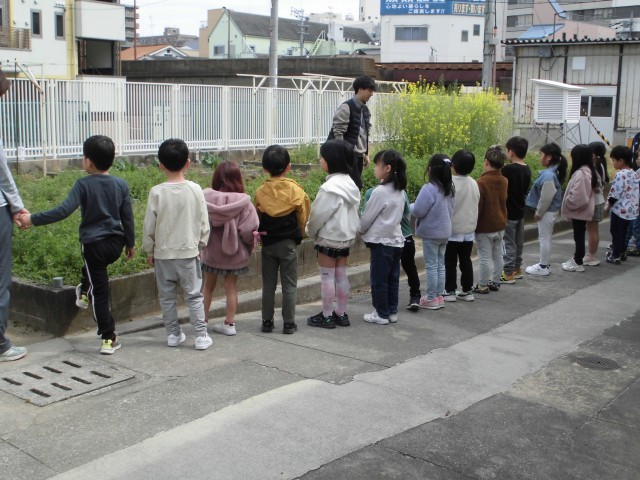 1年生は、教室から並んで外に出て、校庭を歩きました。