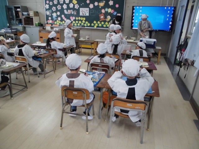 1年生にとっては、小学校生活初めての給食ですね。手を洗い、給食服を着てマスクをし、ナフキンを敷く…どれも勉強です。毎日のことなので、だんだん慣れてきますよ。