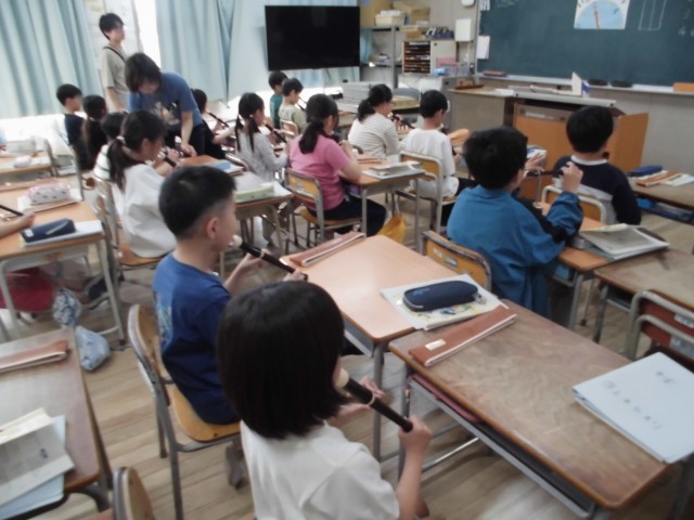 姿勢、指の押さえ方、息の吹き込み方…等々、リコーダーの基本中の基本を覚えています。「シャボン玉が割れないくらいの息の吹き込み方で」きれいな「シ」の音が教室から廊下まで響いています。
