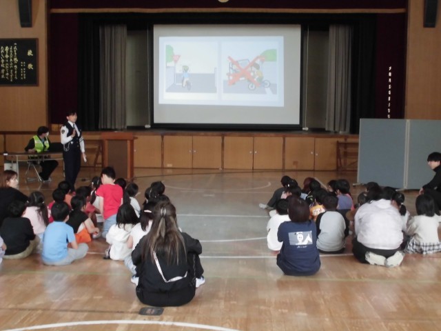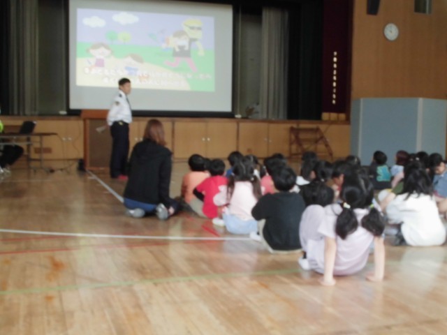 西成警察の方から、防犯のお話と交通安全のお話がありました。途中、劇やクイズもあり楽しく学べましたが、みんな真剣にお話を聞いていました。
