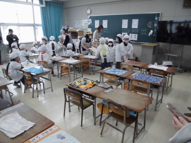 給食着に着替えてナフキンを机にしき、当番さんが重い食器や牛乳を運ぶところから見ていただきました。準備ができたら「いただきます!」みんなおいしそうに食べていました。食べ終わったら片付けも協力してできていました。