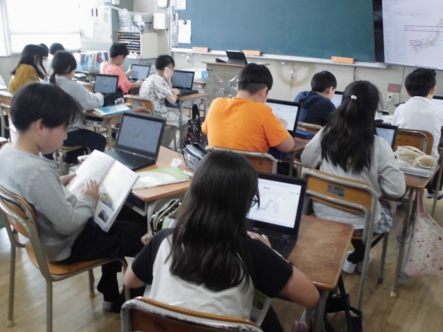 5年生では、日本の地形と気候について学んでいます。南北に長い日本の地形の特徴をパソコンも使って調べていきます。国土への興味が深まるといいですね。