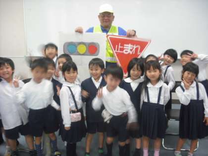 西成警察署と西成区地域防犯「みまもり(青パト)」が来られて、1年生に交通安全と防犯について教えていただきました。