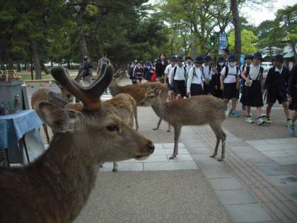 5年生は奈良に、春の遠足にやって来ました。たくさんの鹿に出迎えられました。