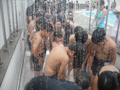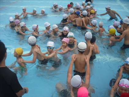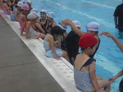 大きなプールで不安そうだった青組さんたちも、5年生のおもてなしに安心したのか、しだいに笑顔が見え出しました。
