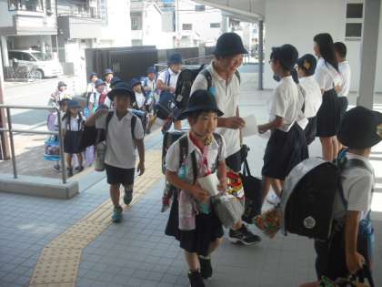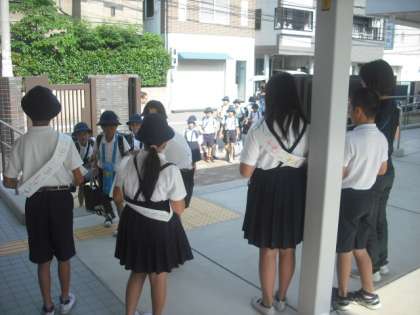 登校した児童に、代表委員会があいさつを呼びかけます。