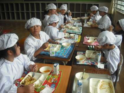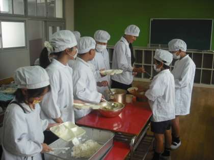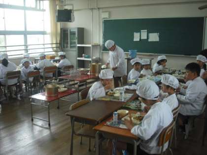 給食調理員さんたちにお手数をかけ、12の教室に分かれて行います。