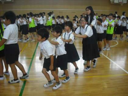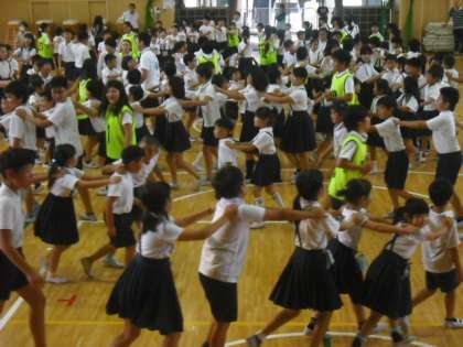 あいにく外は雨ですが、講堂での児童集会は笑顔満開でした。
