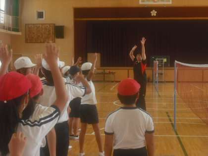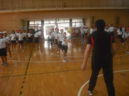 6年生が講堂に集まって、大谷佐知子さんによるお話とバレーボール体験です。