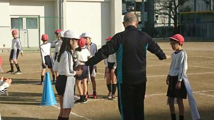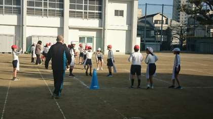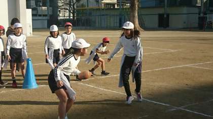 運動場では4年生が「フラッグフットボール」の学習をしています。