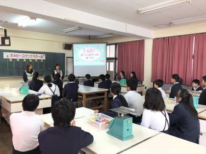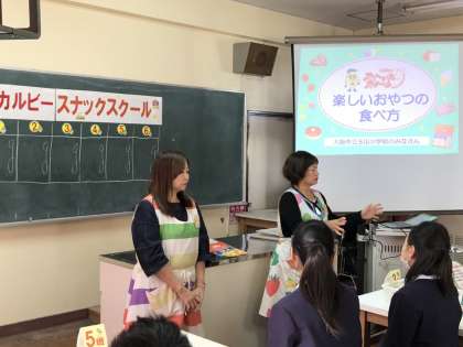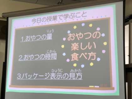 おやつの2つの役割、「体の栄養&心の栄養』を学びました。また、おやつを食べる時の注意として、時間、量、手洗い、汚さない、ご飯が食べられなくなる、などが話し合われました。