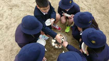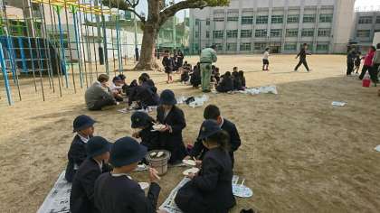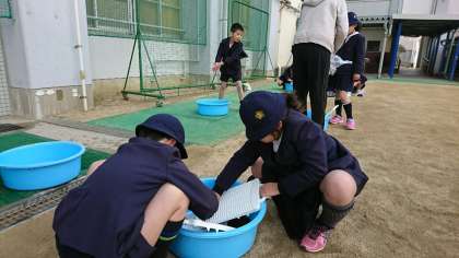 3年生が社会科「昔の暮らし」の発展学習として、運動場で体験学習に取り組みました。