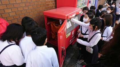 はがきをポストに入れるところから見学がスタートしました。ポストの中を見せてもらいました。ポストには番号が書かれてあって、西成郵便局のポストは100番でした。