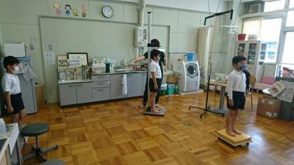 友だちとの間をあけ、廊下に並んで、順番に身長と体重を測定します。