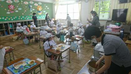 玉出小学校では、午前と午後に分散登校して給食も分かれて食べました。