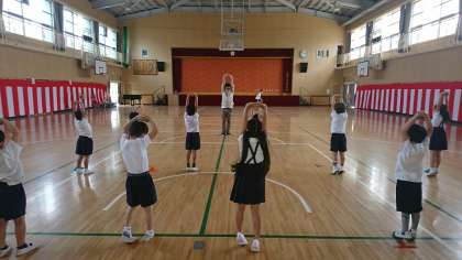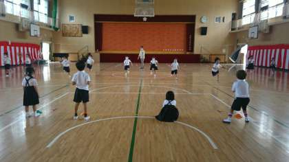 1年1組は運動場で、1年2組は体育館で、かけっこをしました。