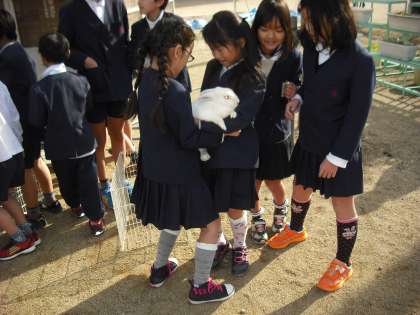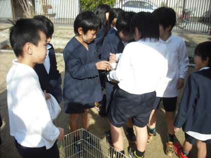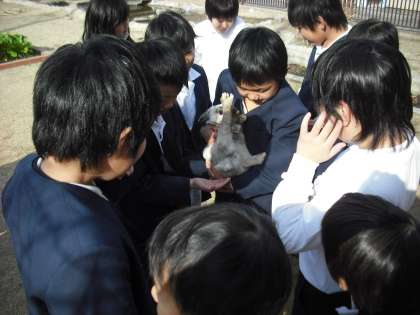 飼育委員会の子供たちが中心になって、うさぎふれあい週間をしています。ラビちゃんと元気ちゃんをだっこして、癒されています。かわいいね。