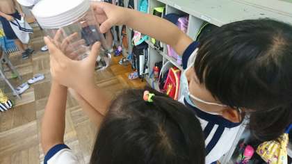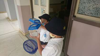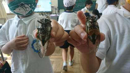 休み時間、1年生が網と虫かごを持って虫さがしをしています。