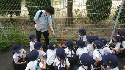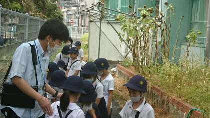 2年2組が生活科の学習のため、雨上がりの学習園にやって来ました。