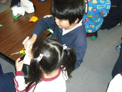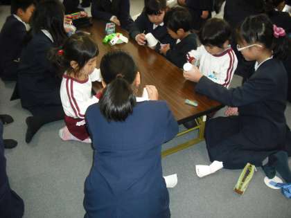 玉出幼稚園の年長さんとパクパク人形を一緒に作りました。やさしく教えてくれるお姉ちゃんやお兄ちゃんが幼稚園の子どもたちは大好きです。帰るとき、「また来てもいい?」と聞いていました。「いいよ」と答える5年生です。