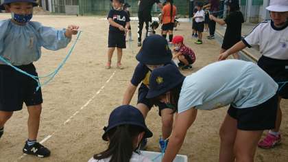 1年生が運動場で生活科の学習をしています。