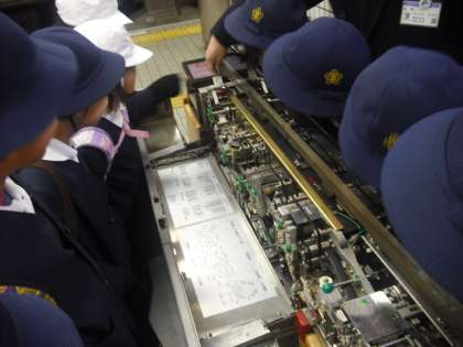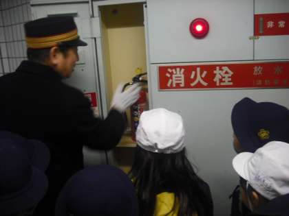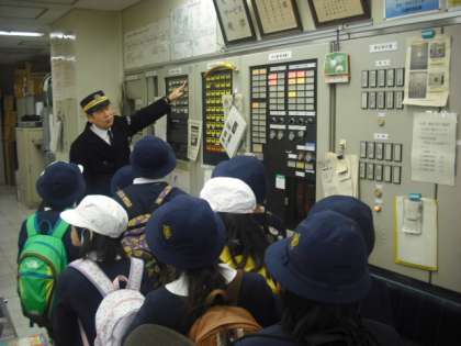 玉出駅から地下鉄に乗り岸里駅に行きました。岸里駅では、4つのグループに分かれ、駅の秘密をいっぱい教えていただきました。券売機の裏に入ったり、駅長室の奥まで見せてもらったり、駅のSOSの場所を聞いたり、駅員さんは、いつも乗客の安全を考えておられました。電車に乗るたびに、わくわくするようなお話がいっぱいでした。