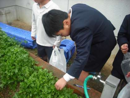 学習園で栽培していた野菜を収穫しました。大きく成長した天王寺かぶらを前にし、いっぱいの笑顔でした。よかったね。
