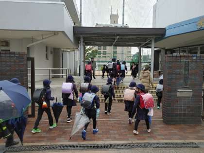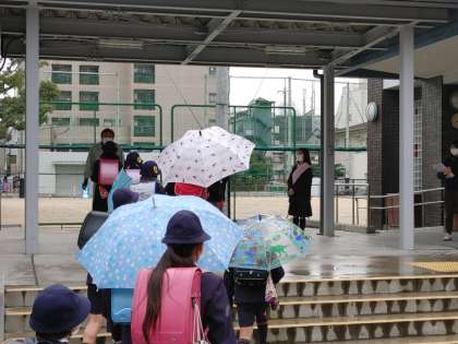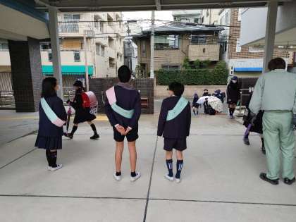 タスキをかけた代表委員会があいさつを呼び掛け、しっかりこたえる子どもたちの姿が見られました。