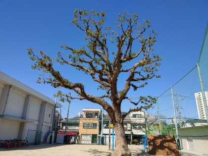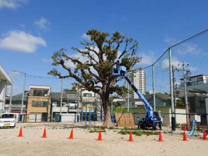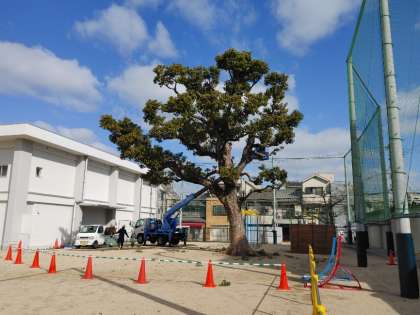 玉出小学校ではクスノキの剪定作業が朝から開始されました。