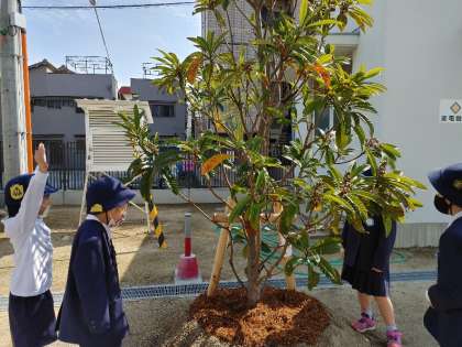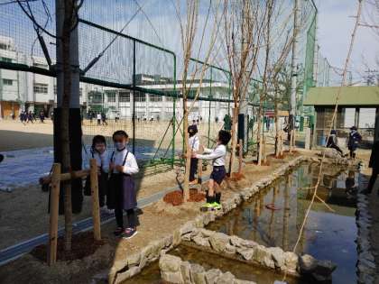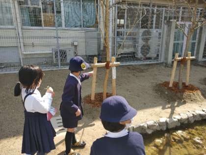 休み時間、植樹された樹木に子どもたちが集まってきました。