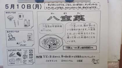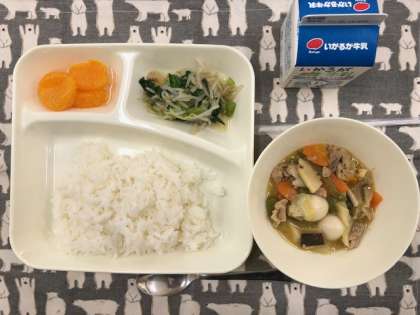 本日の献立は、八宝菜、チンゲン菜ともやしの生姜和え、ごはん、牛乳、みかんの缶詰です。