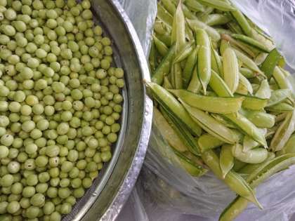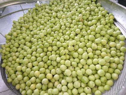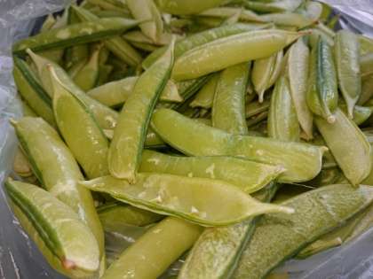 えんどうの卵とじに使われているえんどうは、給食室で「さや」から取り出した「生のえんどう」を使用して調理されています。