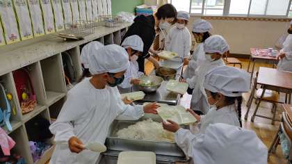 4月当初は6年生に手伝ってもらっていましたが、今では1年生も上手に配膳できるようになりました。写真は1年2組の様子です。